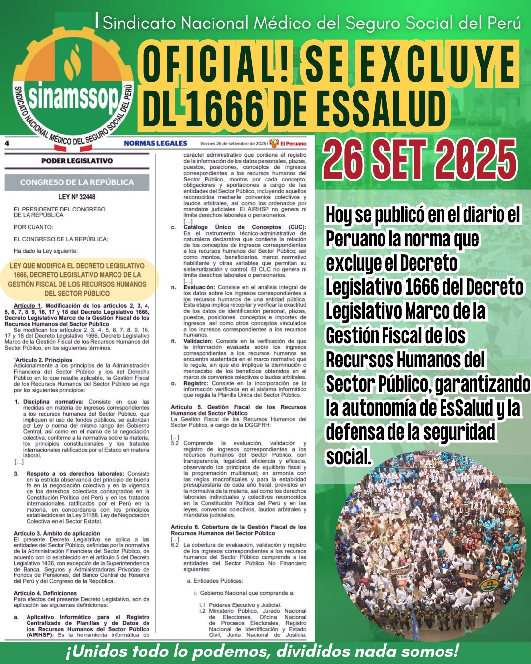 Hoy, 26 de setiembre de 2025, en el diario El Peruano se publicó la norma que EXCLUYE a EsSalud del Decreto Legislativo 1666, dentro del Decreto Legislativo Marco