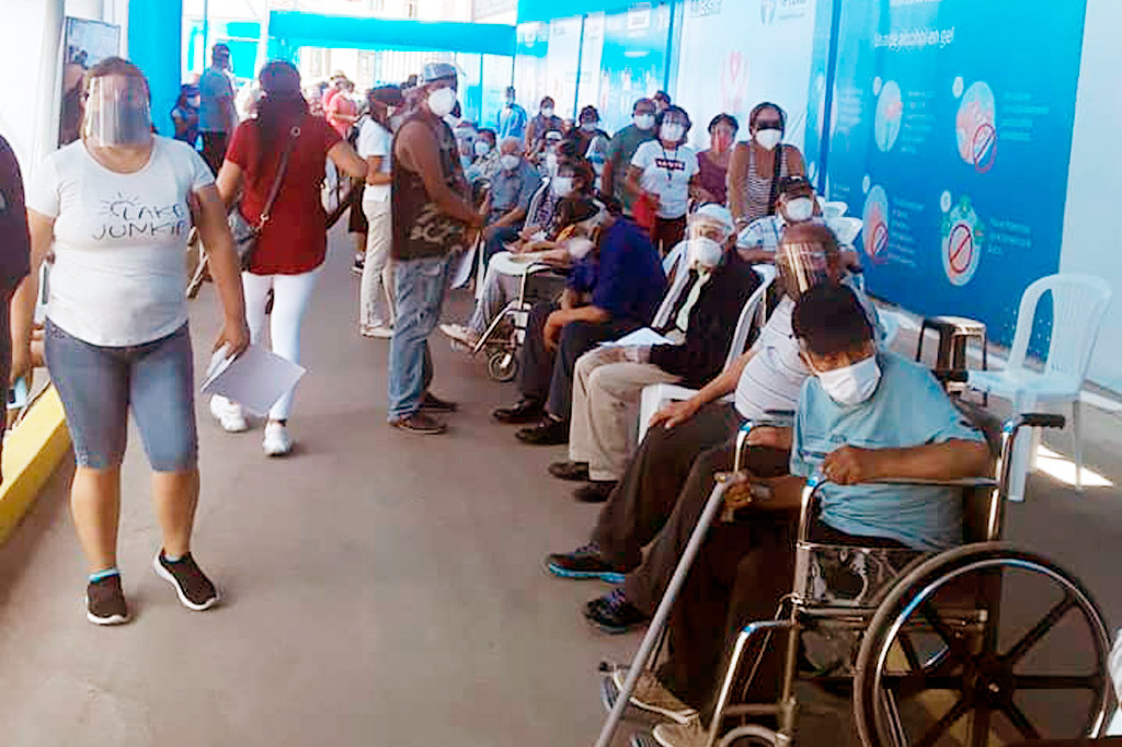 Pacientes adultos mayores del Hospital Emergencias Grau – Sede Aljovin, están desesperados esperando por varias horas la llegada de las vacunas, las cuales se han acabado por la sobre demanda