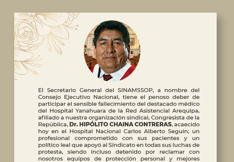 El Secretario General del SINAMSSOP, a nombre del Consejo Ejecutivo Nacional, tiene el penoso deber de participar el sensible fallecimiento del destacado médico del Hospital Yanahuara de la Red Asistencial
