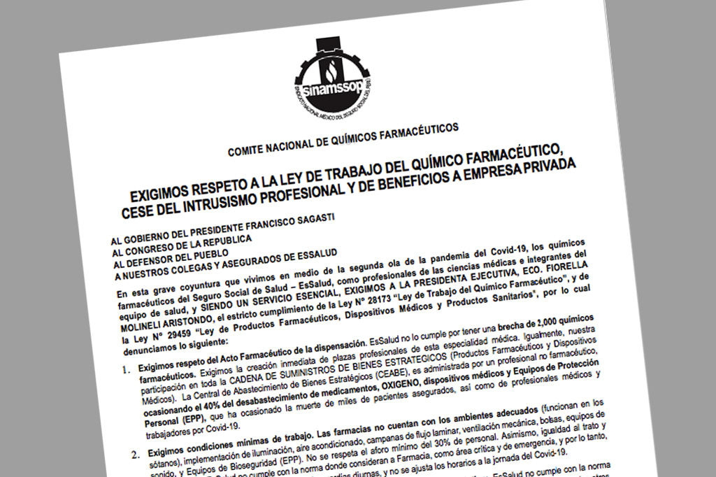 COMITE NACIONAL DE QUÍMICOS FARMACÉUTICOS AL GOBIERNO DEL PRESIDENTE FRANCISCO SAGASTIAL CONGRESO DE LA REPUBLICAAL DEFENSOR DEL PUEBLOA NUESTROS COLEGAS Y ASEGURADOS DE ESSALUD En esta grave coyuntura que vivimos