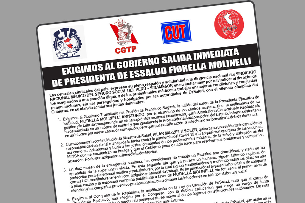 EXIGIMOS AL GOBIERNO SALIDA INMEDIATA DE PRESIDENTA DE ESSALUD FIORELLA MOLINELLI Las centrales sindicales del país, expresan su pleno respaldo y solidaridad a la dirigencia nacional del SINDICATO NACIONAL MÉDICO