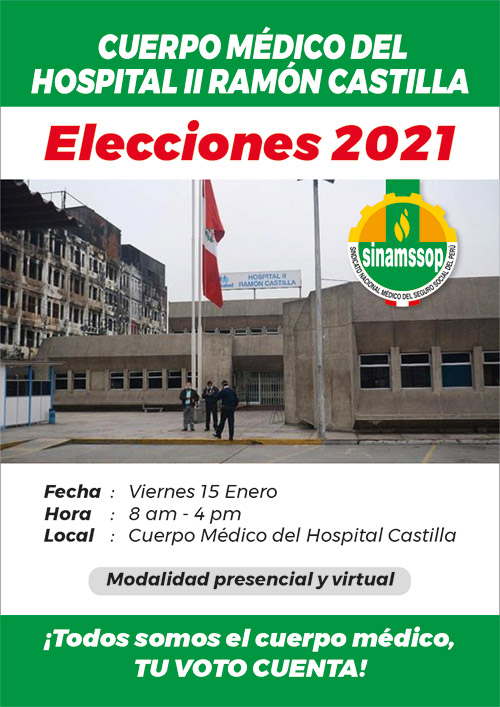 Fecha : Viernes 15 Enero Hora : 8 am – 4 pm Local : Cuerpo Médico del Hospital Castilla Modalidad presencial y virtual ¡Todos somos el cuerpo médico, TU VOTO