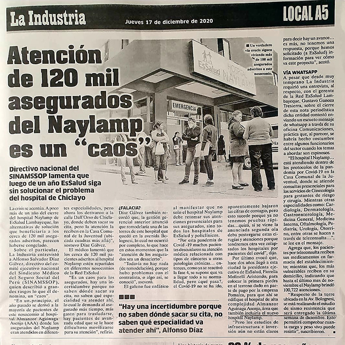 Directivo nacional del SINAMSSOP lamenta que luego de un año EsSalud siga sin solucionar el problema del hospital de Chiclayo