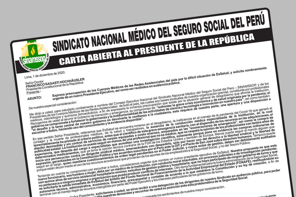 NOTA DE PRENSA N° 068-2020-SINAMSSOP En carta abierta entregada ayer en Palacio de Gobierno y publicada hoy en La República Una carta abierta al presidente de la República, Francisco