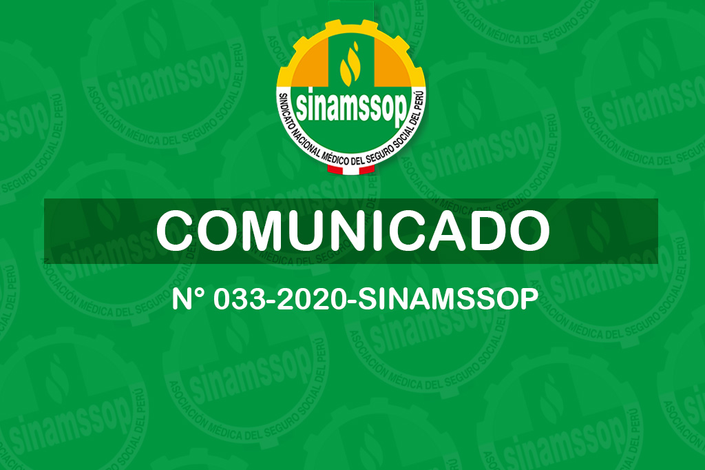 COMUNICADO N° 033-2020-SINAMSSOP El Secretario General y el Consejo Ejecutivo Nacional del Sindicato Nacional Médico del Seguro Social del Perú – SINAMSSOP, ratifican ante sus afiliados médicos, odontólogos y químicos