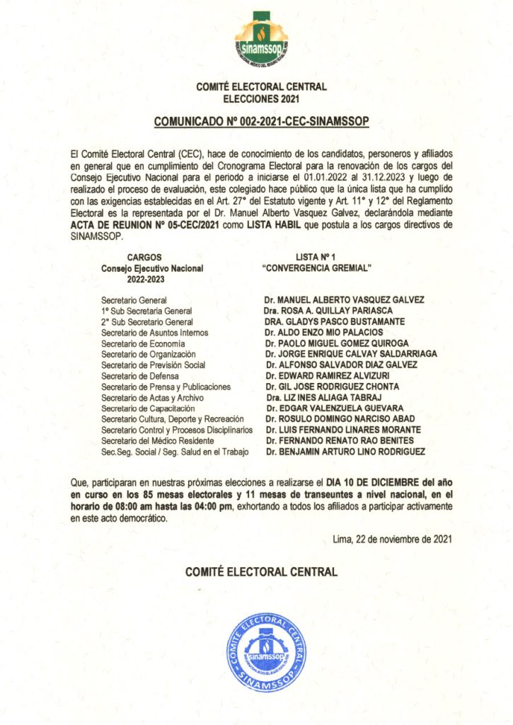 Comité Electoral Central - Elecciones 2021 - Comunicado Nº 002-2021-CEC-SINAMSSOP