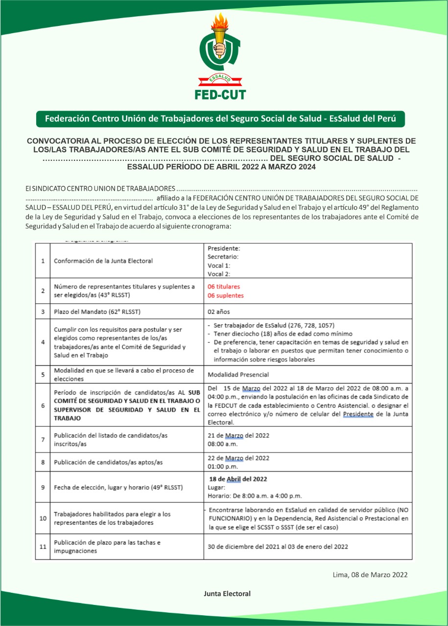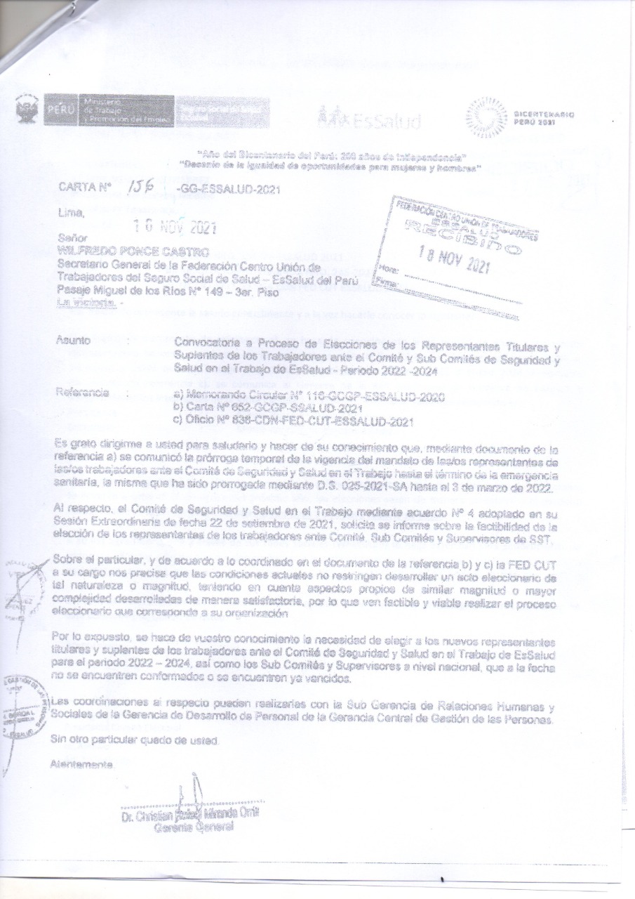 - El Gobierno mediante Decreto Supremo N° 025-2021-SA, dispuso la prórroga de las elecciones hasta el 3 de marzo del 2022, fecha de término de la emergencia sanitaria, pero la Gerencia General de EsSalud, mediante Carta N° 156-GG-ESSALUD-2021, del 16 de noviembre pasado, comunicó a la FED CUT como sindicato más representativo “la necesidad” de llevar adelante el proceso electoral por “coordinaciones internas” entre el Comité de Seguridad y Salud en el Trabajo, la FED CUT y la Gerencia General.