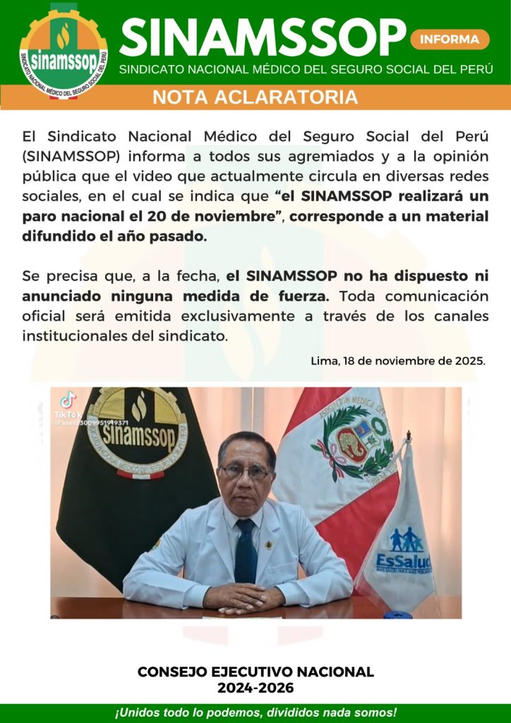 El Sindicato Nacional Médico del Seguro Social del Perú (SINAMSSOP) informa a todos sus agremiados y a la opinión pública que el video que actualmente circula en diversas redes sociales, en el cual se indica que “el SINAMSSOP realizará un paro nacional el 20 de noviembre”, corresponde a un material difundido el año pasado.