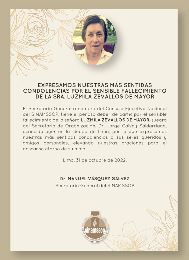 El Secretario General a nombre del Consejo Ejecutivo Nacional del SINAMSSOP, tiene el penoso deber de participar el sensible fallecimiento de la señora LUZMILA ZEVALLOS DE MAYOR, suegra del Secretario de Organización, Dr. Jorge Calvay Saldarriaga, acaecido ayer en la ciudad de Lima, por lo que expresamos nuestras más sentidas condolencias a sus seres queridos y amigos personales, elevando nuestras oraciones para el descanso eterno de su alma.