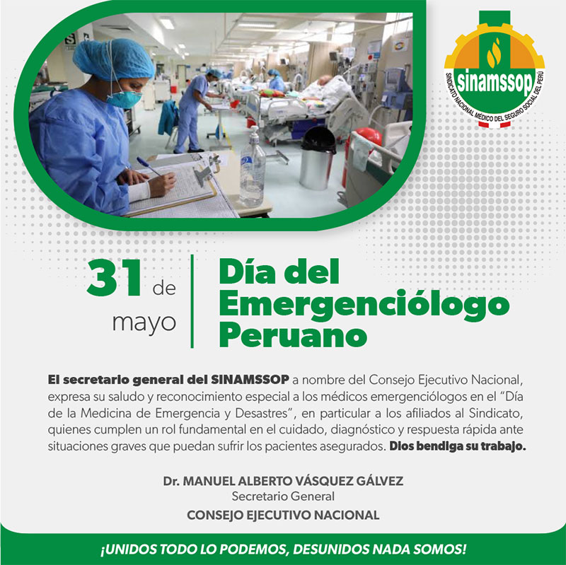 El secretario general del SINAMSSOP a nombre del Consejo Ejecutivo Nacional, expresa su saludo y reconocimiento especial a los médicos emergenciólogos en el “Día de la Medicina de Emergencia y Desastres”, en particular a los afiliados al Sindicato, quienes cumplen un rol fundamental en el cuidado, diagnóstico y respuesta rápida ante situaciones graves que puedan sufrir los pacientes asegurados. Dios bendiga su trabajo.