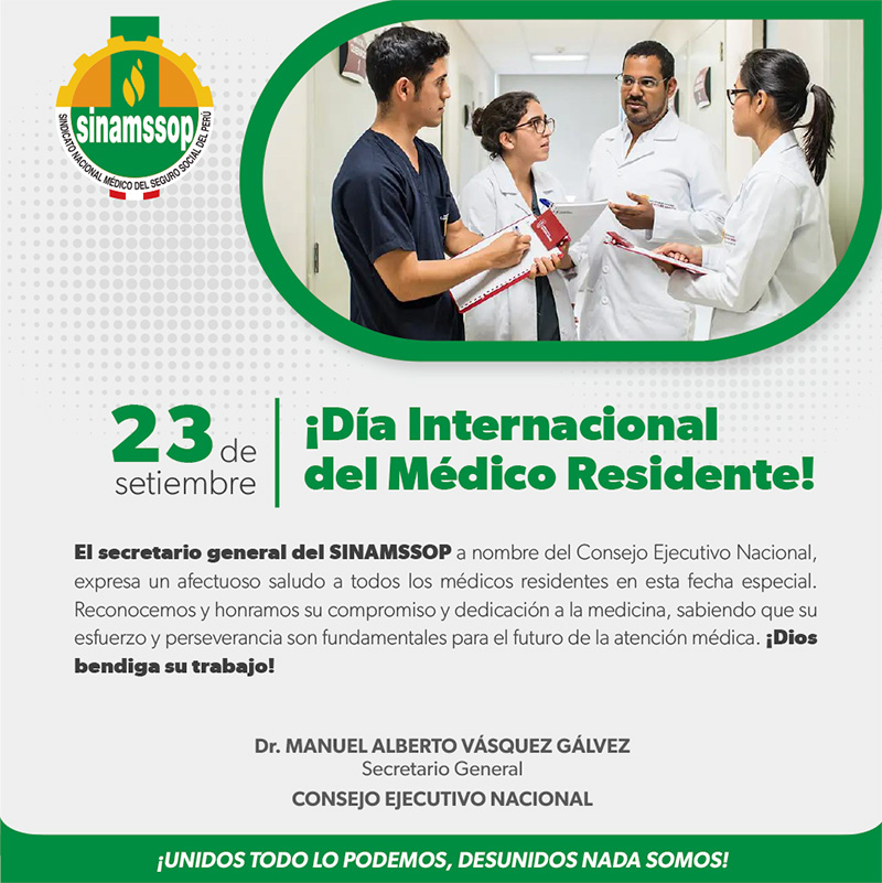 El secretario general del SINAMSSOP a nombre del Consejo Ejecutivo Nacional, expresa un afectuoso saludo a todos los médicos residentes en esta fecha especial. Reconocemos y honramos su compromiso y dedicación a la medicina, sabiendo que su esfuerzo y perseverancia son fundamentales para el futuro de la atención médica. ¡Dios bendiga su trabajo!