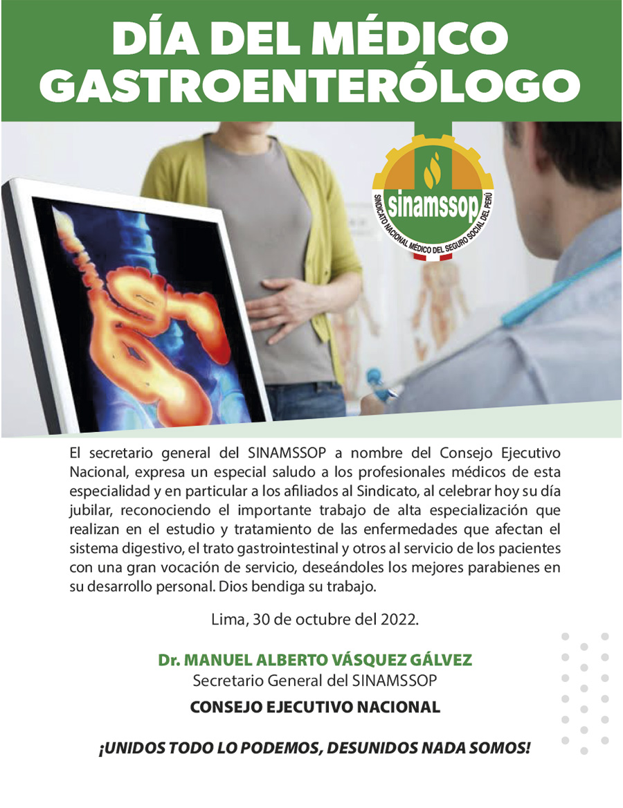 El secretario general del SINAMSSOP a nombre del Consejo Ejecutivo Nacional, expresa un especial saludo a los profesionales médicos de esta especialidad y en particular a los afiliados al Sindicato, al celebrar hoy su día jubilar, reconociendo el importante trabajo de alta especialización que realizan en el estudio y tratamiento de las enfermedades que afectan el sistema digestivo, el trato gastrointestinal y otros al servicio de los pacientes con una gran vocación de servicio, deseándoles los mejores parabienes en su desarrollo personal. Dios bendiga su trabajo.