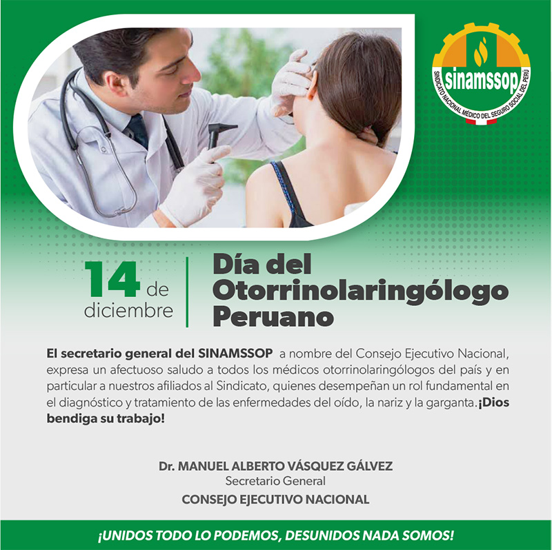 El secretario general del SINAMSSOP a nombre del Consejo Ejecutivo Nacional, expresa un afectuoso saludo a todos los médicos otorrinolaringólogos del país y en particular a nuestros afiliados al Sindicato, quienes desempeñan un rol fundamental en el diagnóstico y tratamiento de las enfermedades del oído, la nariz y la garganta.¡Dios bendiga su trabajo!