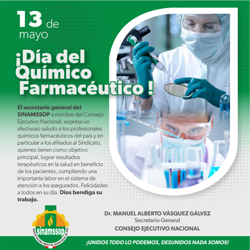 El secretario general del SINAMSSOP a nombre del Consejo Ejecutivo Nacional, expresa un afectuoso saludo a los profesionales químicos farmacéuticos del país y en particular a los afiliados al Sindicato, quienes tienen como objetivo principal, lograr resultados terapéuticos en la salud en beneficio de los pacientes, cumpliendo una importante labor en el sistema de atención a los asegurados. Felicidades a todos en su día. Dios bendiga su trabajo.