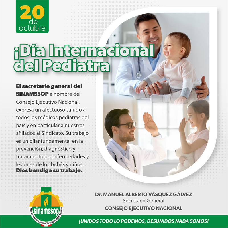 El secretario general del SINAMSSOP a nombre del Consejo Ejecutivo Nacional, expresa un afectuoso saludo a todos los médicos pediatras del país y en particular a nuestros afiliados al Sindicato. Su trabajo es un pilar fundamental en la prevención, diagnóstico y tratamiento de enfermedades y lesiones de los bebés y niños. ¡Dios bendiga su trabajo!