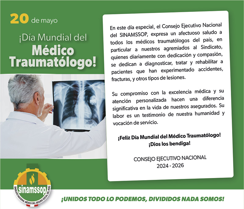 En este día especial, el Consejo Ejecutivo Nacional del SINAMSSOP, expresa un afectuoso saludo a todos los médicos traumatólogos del país, en particular a nuestros agremiados al Sindicato, quienes diariamente con dedicación y compasión, se dedican a diagnosticar, tratar y rehabilitar a pacientes que han experimentado accidentes, fracturas, y otros tipos de lesiones.