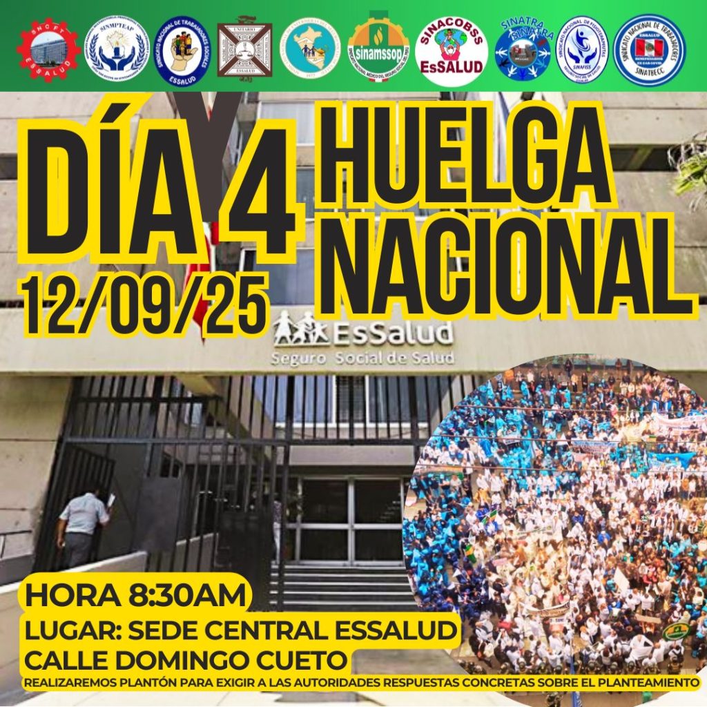 Mañana 12 de septiembre de 2025, continuamos firmes en nuestra medida de lucha nacional. Desde las 8:30 a.m. en la Sede Central de EsSalud (Calle Domingo Cueto), médicos, trabajadores y gremios unidos exigimos a las autoridades respuestas claras y soluciones reales a nuestro pliego de reclamos.