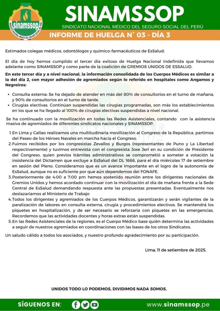 Hoy culminamos con éxito el tercer día de nuestra Huelga Nacional Indefinida, logrando una mayor adhesión de los agremiados, con más del 80% de consultorios paralizados en la mañana y 90% en la tarde, y la suspensión de 100% de cirugías electivas en varios establecimientos.