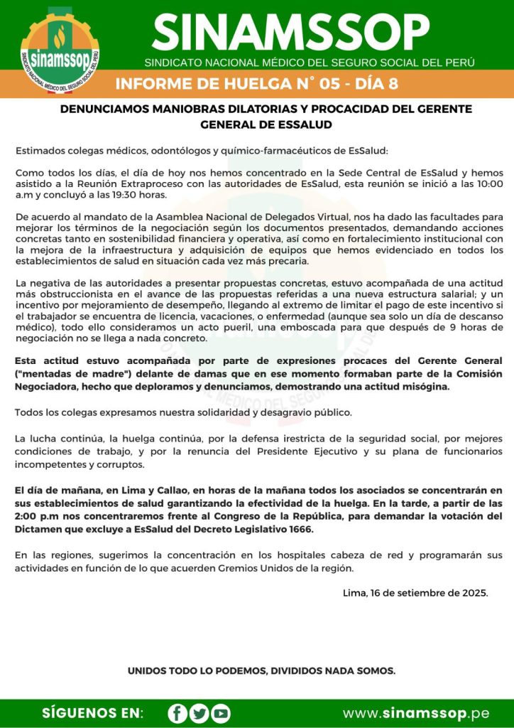Denunciamos las Maniobras dilatorias y la procacidad del Gerente General de EsSalud, quien ha demostrado una actitud obstruccionista, misógina y carente de propuestas concretas en la mesa de negociación.
