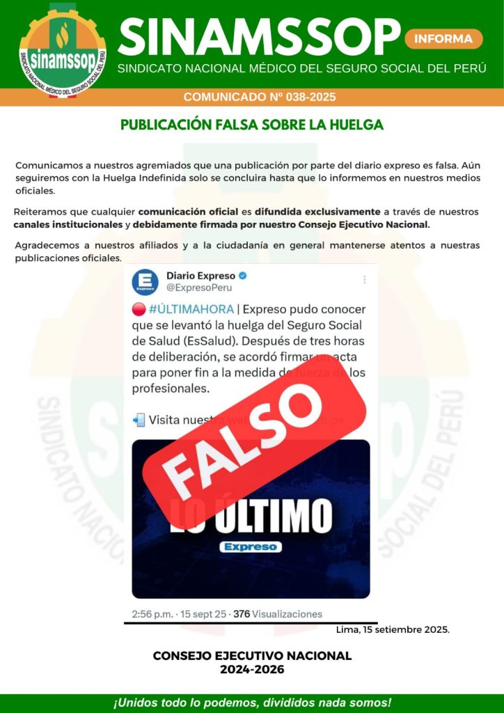 El SINAMSSOP informa a todos nuestros afiliados y a la ciudadanía en general que circula una publicación FALSA sobre el levantamiento de la huelga indefinida del Seguro Social de Salud (EsSalud).