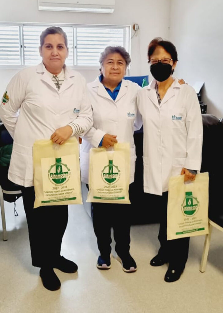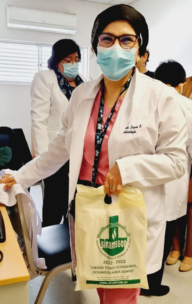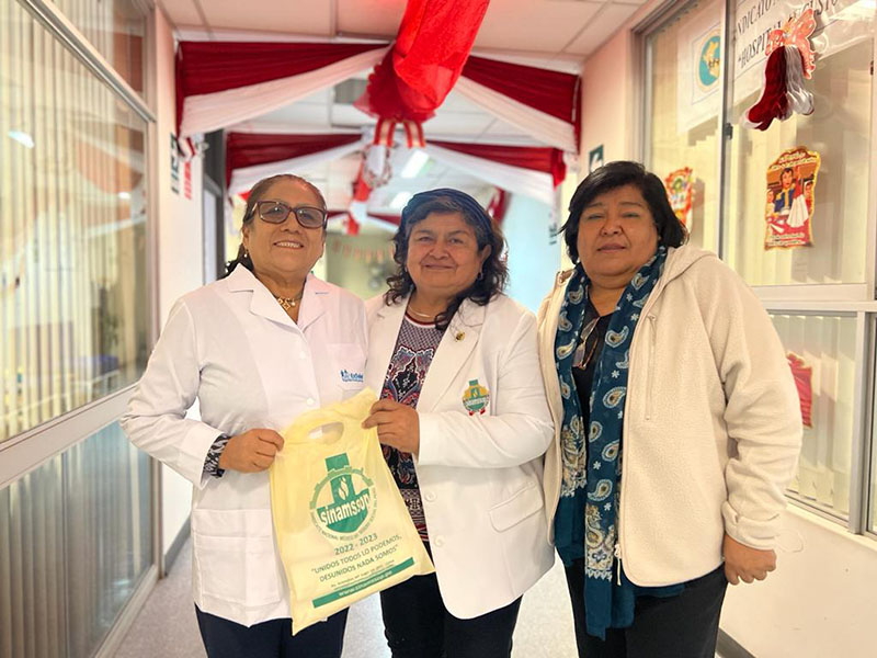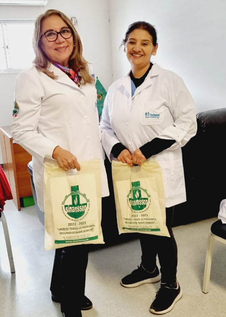 El último fin de semana, durante su estadía por la ciudad del eterno sol, el secretario general del SINAMSSOP, Manuel Vásquez y la primera subsecretaria, Rosa Quillay hicieron entrega de chaquetas tipo Blazer a las afiliadas del Cuerpo Médico “Augusto Hernandez Mendoza” y “Felix Torrealva Gutierrez”de la Red Asistencial Ica.