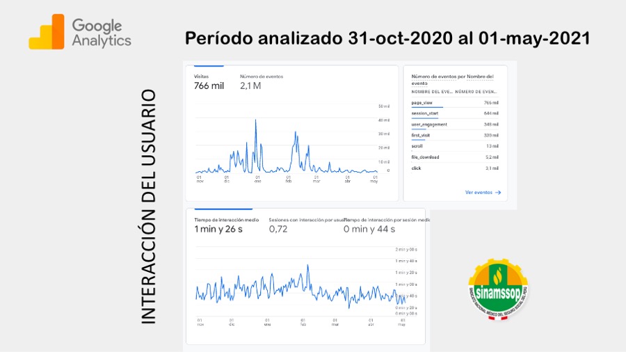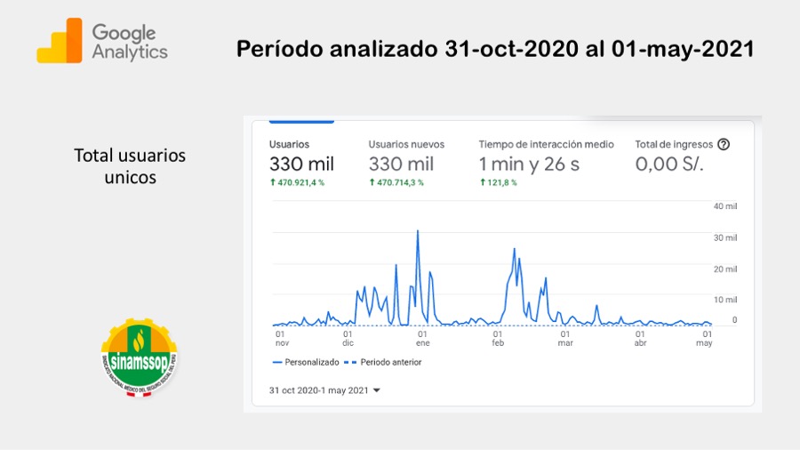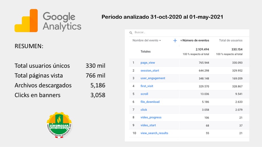 Entre octubre del 2020 y mayo de este año, más de 330 mil personas han visitado nuestra nueva página web sinamssop.pe, las que representan 766 mil páginas vistas, más de 5,200 documentos descargados entre notas de prensa, comunicados, entrevistas de televisión, normas legales, información periodística diaria y otros; así como también, se registran más de 3,000 clics en banners, reveló el informe certificado de Google Analytics solicitado por SINAMSSOP ante las acciones de interferencia ejecutadas por los troll de EsSalud, que denuncian permanentemente nuestras publicaciones con el afán de callarnos, y quienes emiten comentarios sobre que “nadie lee” nuestras publicaciones.
