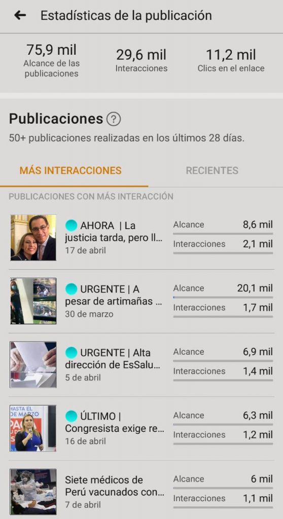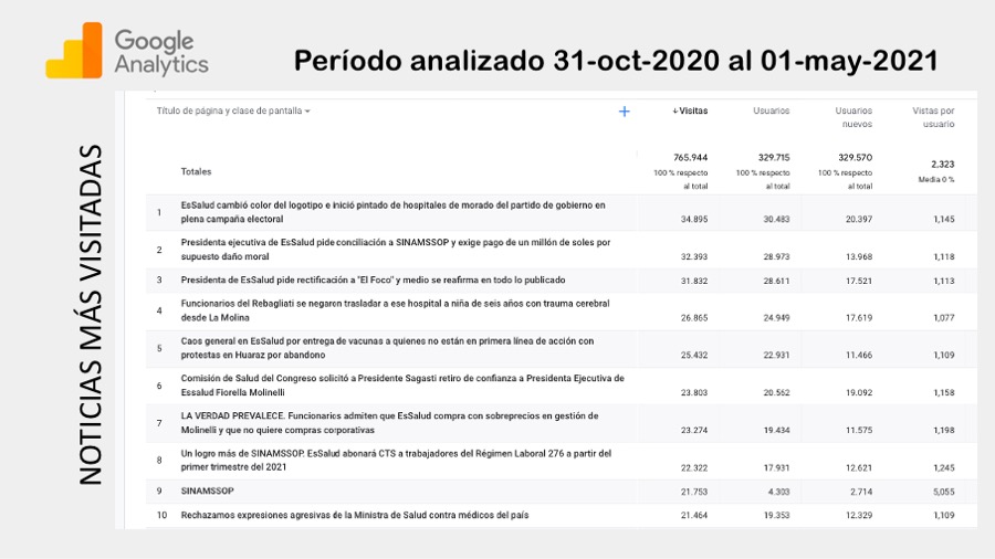 El informe destaca entre las cinco noticias más visitas: a “EsSalud cambió color de logotipo e inició pintado de hospitales de morado del partido de gobierno en plena campaña electoral” con 30,483 usuarios y 34,895 vistas; “Presidenta ejecutiva de EsSalud pide conciliación a SINAMSSOP y exige pago de un millón de soles por supuesto daño moral” con 28,983 usuarios y 32,393 vistas; “Presidenta de EsSalud pide rectificación a El Foco y medio se reafirma en todo lo publicado” con 28,611 usuarios y 31,832 vistas; “Funcionarios del Rebagliati se negaron trasladar a ese hospital a niña de 6 años con trauma cerebral desde Las Molina” con 24,949 usuarios y 26,865 vistas; y “Caos general en EsSalud por entrega de vacunas a quienes no están en primera línea de acción con protestas en Huaraz por abandono” con 22,931 usuarios y 25,432 vistas. Estas informaciones han rebotado en varios medios de comunicación nacional e internacional, como Efe, Reuters, The New York Times, France24 y Televisa.