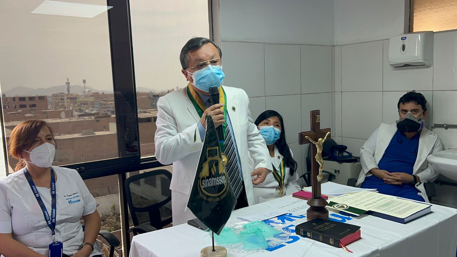 Así se expresó el Secretario General del SINAMSSOP, Manuel Vásquez Gálvez, durante la ceremonia de juramentación de la nueva Junta Directiva del Cuerpo Médico del Policlínico El Retablo Comas para el periodo 2022 – 2024, que preside la doctora, Rosemary Huaman Quispe. “Felicito la recomposición de este Cuerpo Médico que ya existía antes como CAP Bellavista Callao, pero los nombres no cambian realidades porque el espíritu de lucha siempre estará presente en cada acto para la defensa de nuestras justas reivindicaciones”, dijo.
