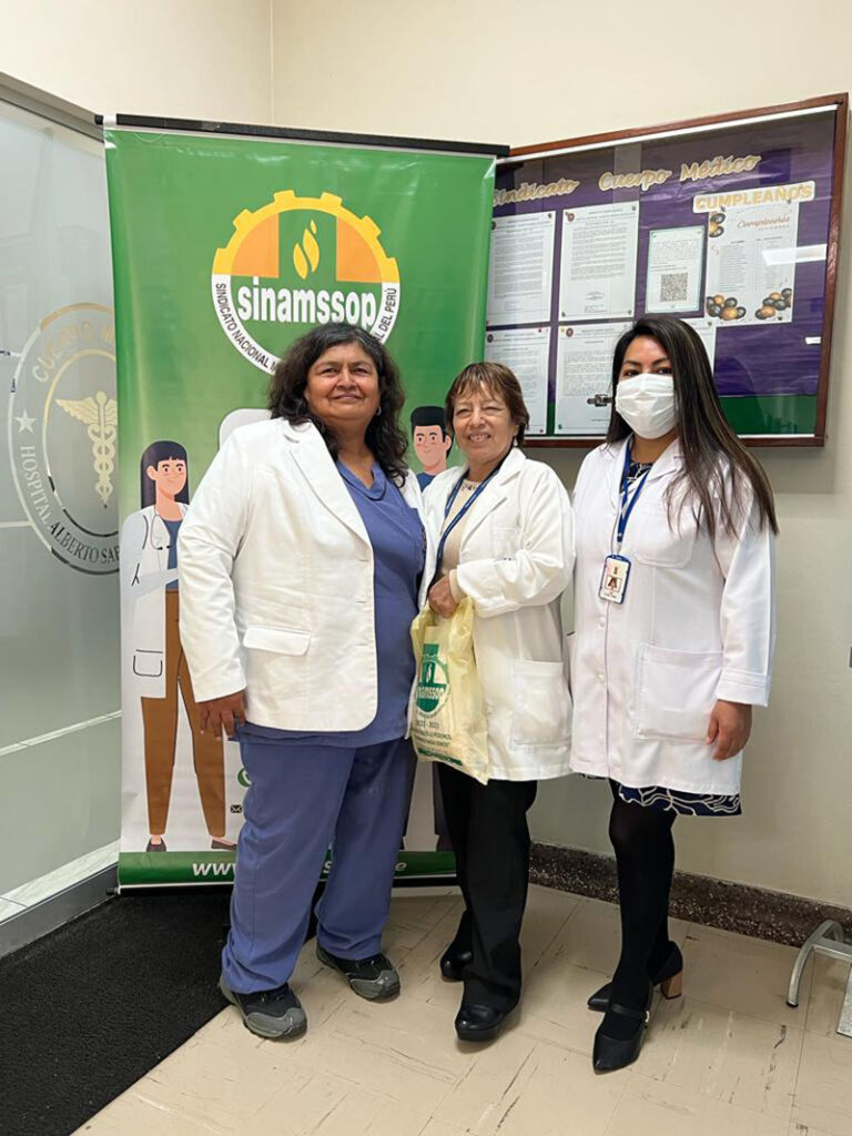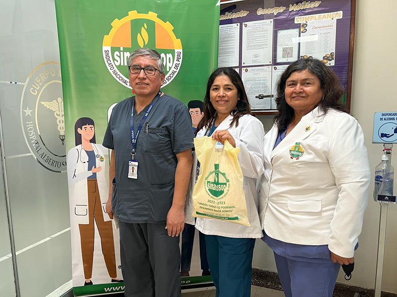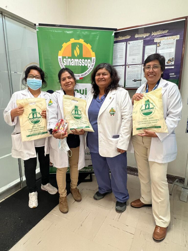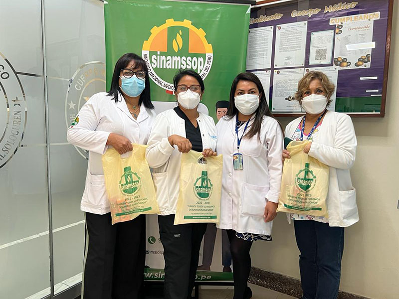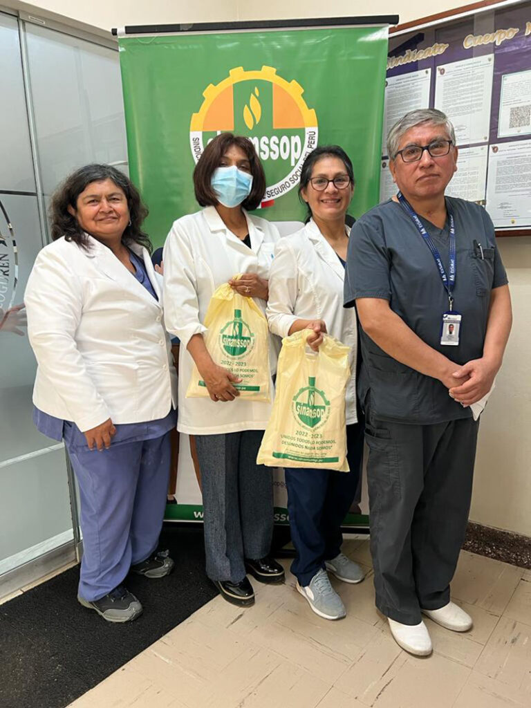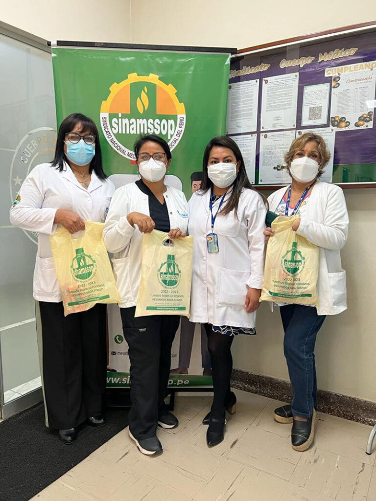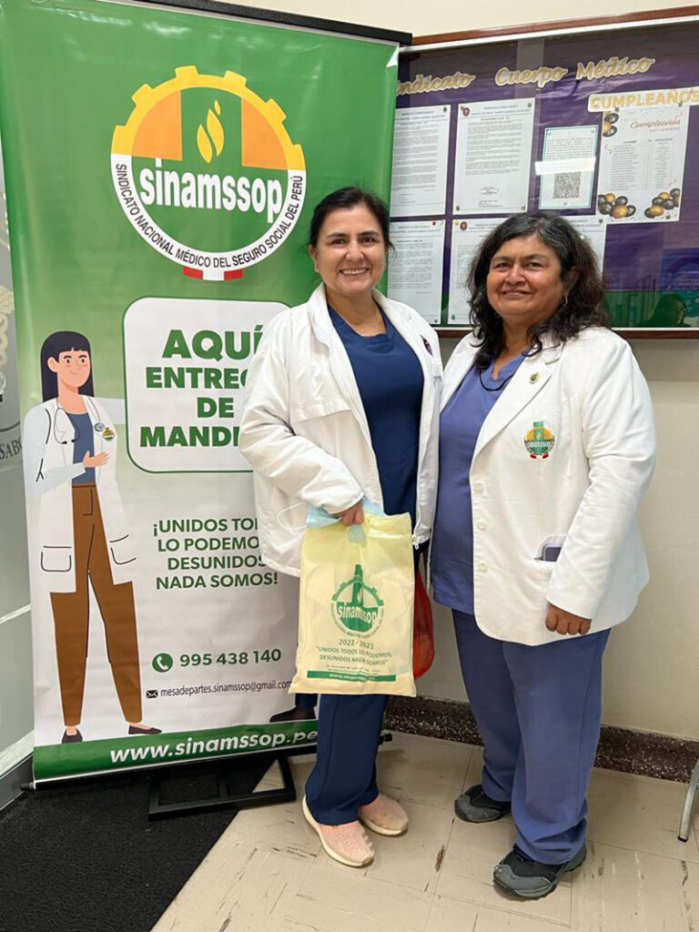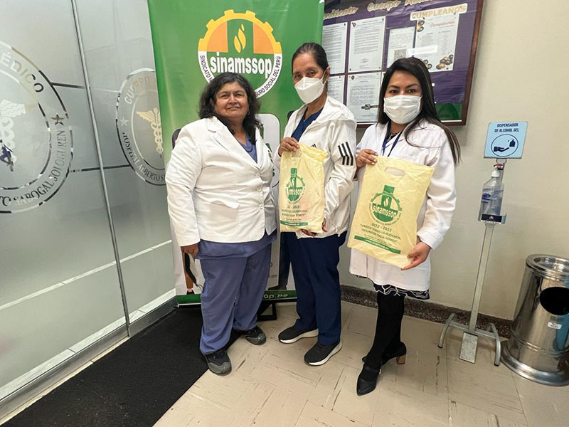 En representación del secretario general del Sinamssop, la primera subsecretaria, Rosa Quillay, y la secretaria de Actas y Archivo, Liz Aliaga; realizaron hoy la última entrega de mandiles para las agremiadas de la base sindical del Hospital Nacional “Alberto Sabogal Sologuren”. Fueron más de 50 agremiadas quienes recibieron y agradecieron este presente al Sindicato.