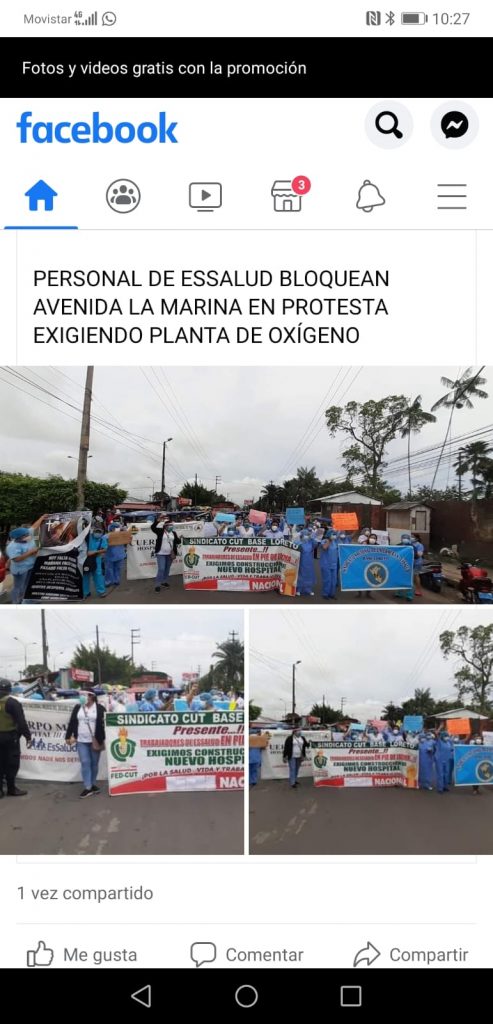Un gran plantón de protesta, realizaron esta mañana decenas médicos, enfermeras, técnicos y trabajadores del Hospital III de Iquitos, quienes tomaron la avenida La Marina, reclamando por la falta de oxígeno que viene costando la vida de pacientes todos los días, por la indiferencia e incapacidad de gestión de las autoridades de EsSalud, que en 11 meses de pandemia no pueden resolver el problema, sostuvo la presidenta del Cuerpo Médico, Yesenia Ramos.