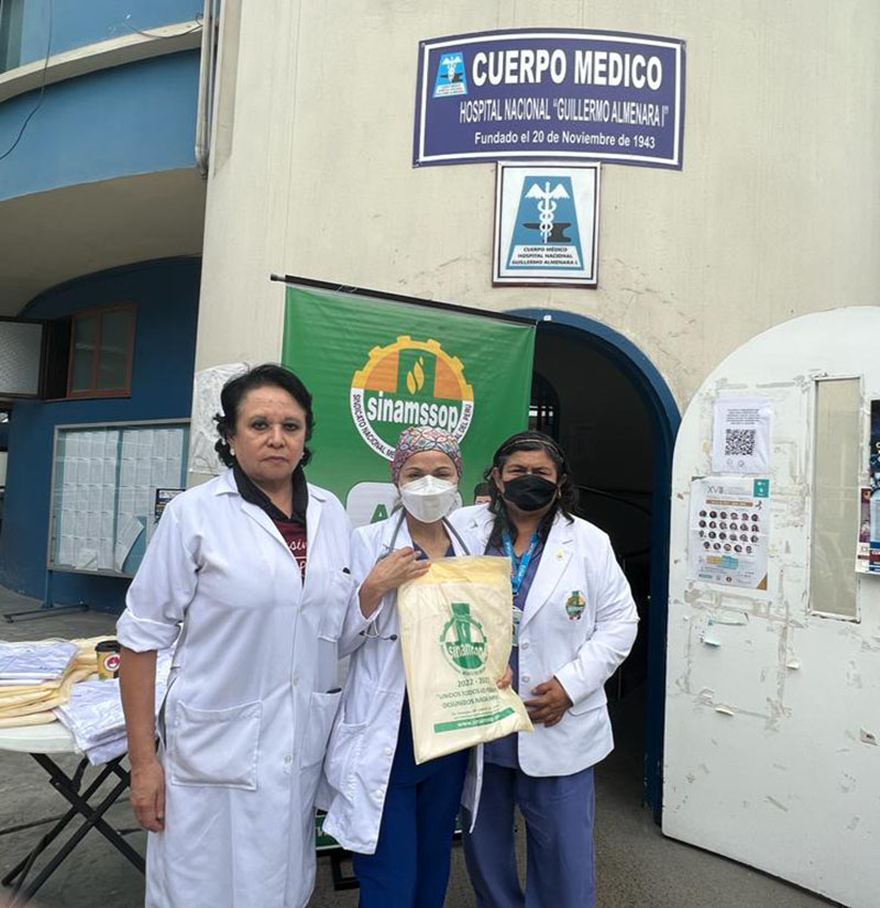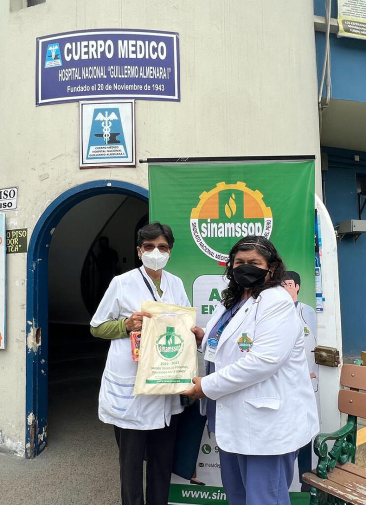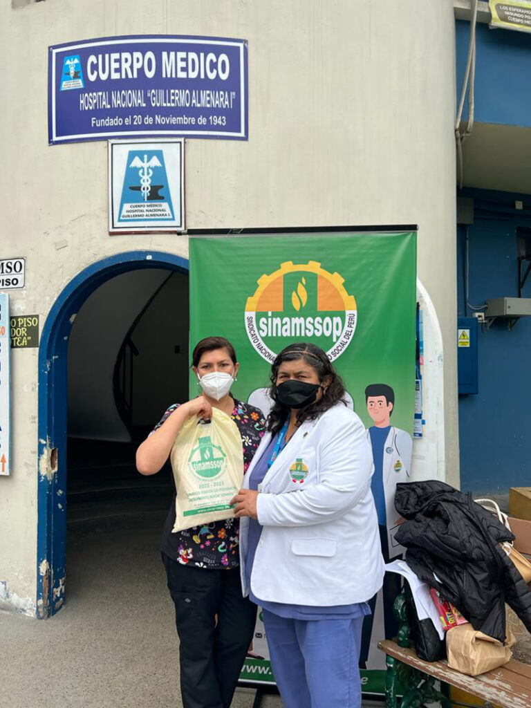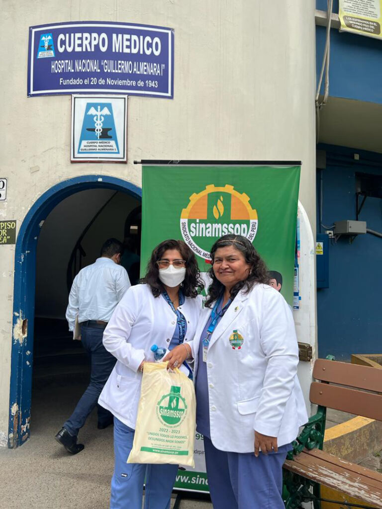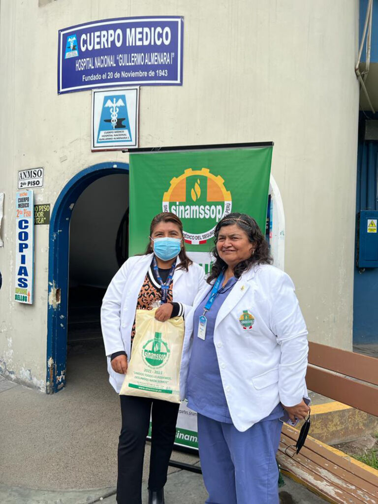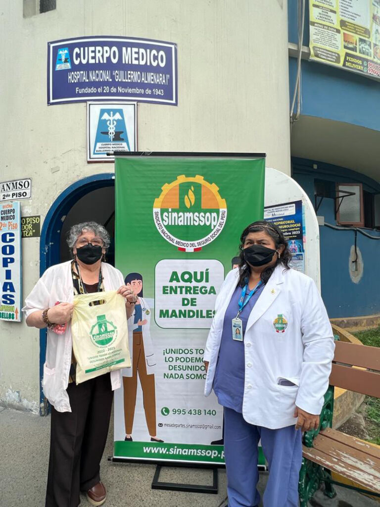La primera subsecretaria, Rosa Quillay y la segunda subsecretaria del Sindicato, Gladys Pasco, hoy desde las 11:00 am en la entrada del cuerpo médico, llevaron a cabo la entrega de mandiles para las agremiadas del Hospital Nacional “Guillermo Almenara Irigoyen”.