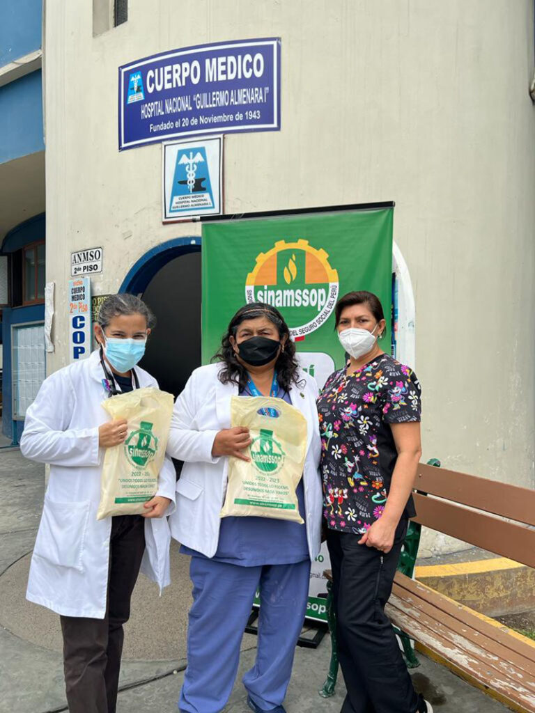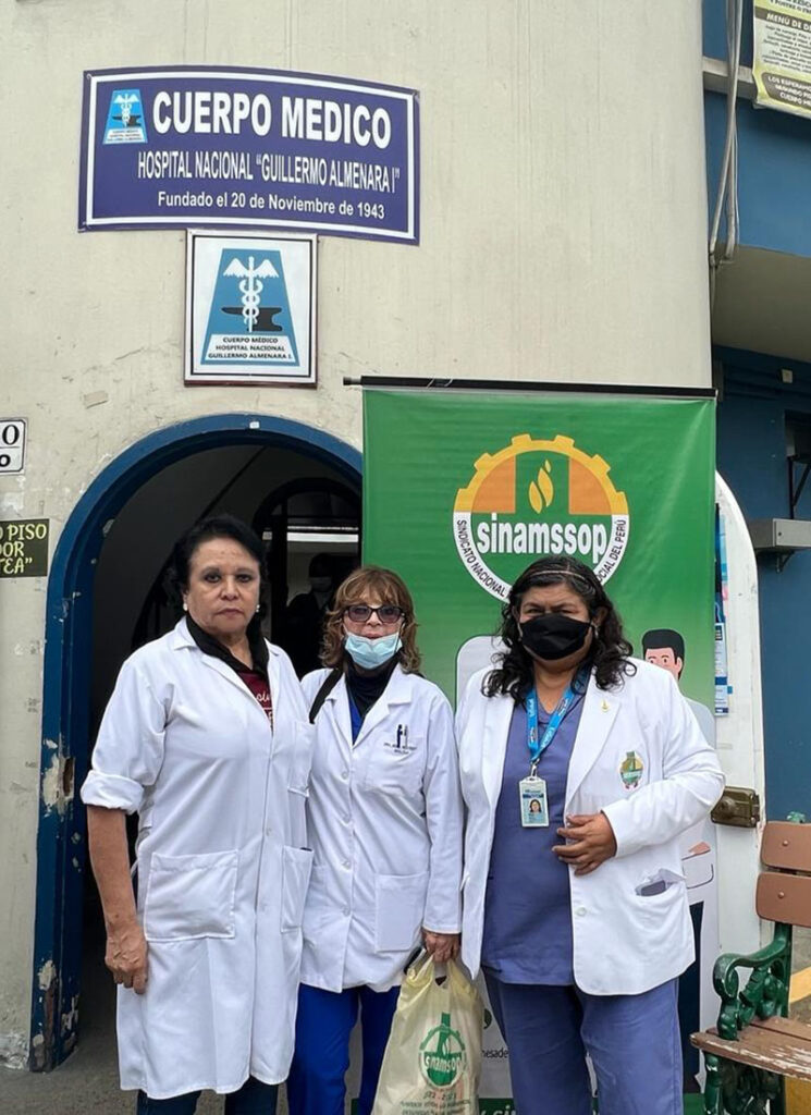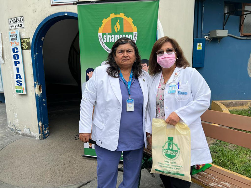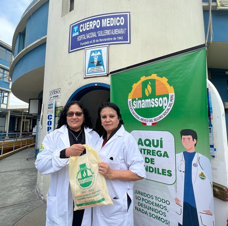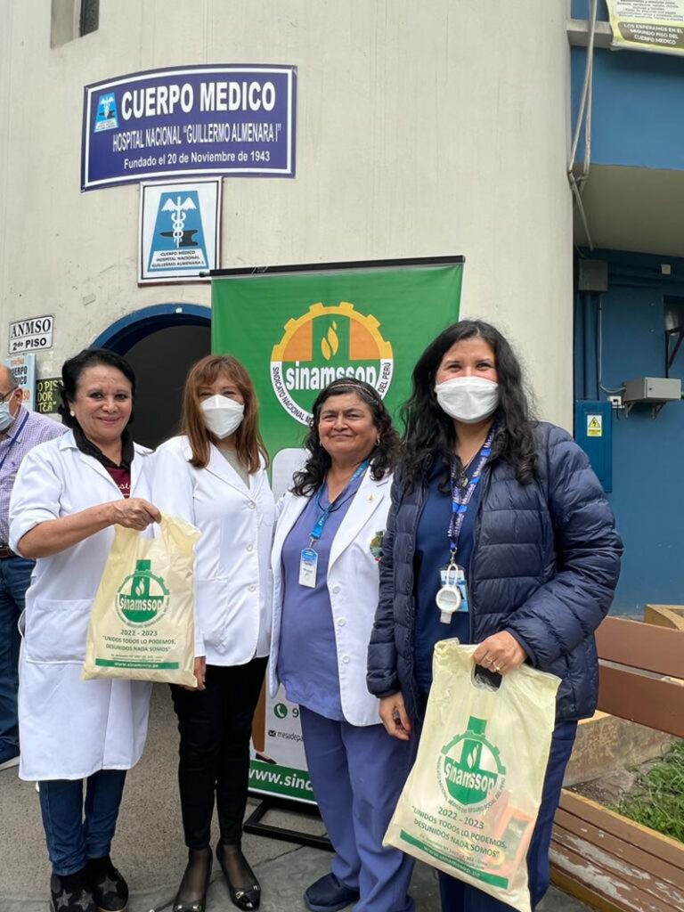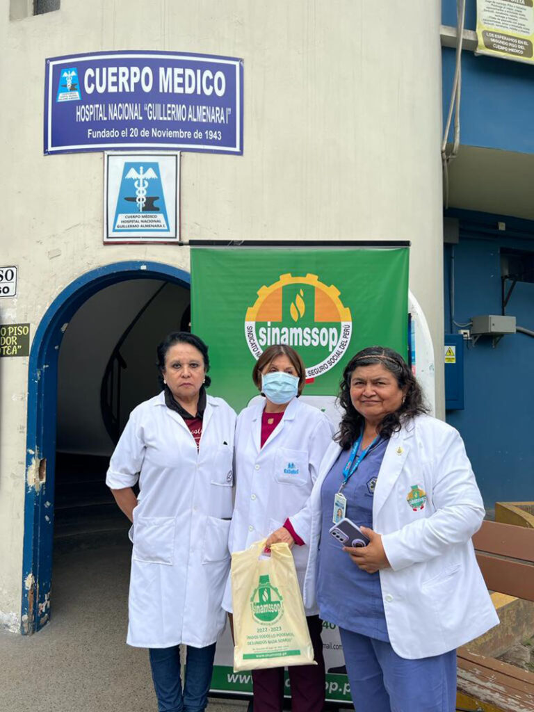 La primera subsecretaria, Rosa Quillay y la segunda subsecretaria del Sindicato, Gladys Pasco, hoy desde las 11:00 am en la entrada del cuerpo médico, llevaron a cabo la entrega de mandiles para las agremiadas del Hospital Nacional “Guillermo Almenara Irigoyen”.