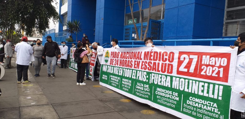 Hoy se realizó el plantón de protesta en el Hospital Emergencias Grau, en el cual el presidente del Cuerpo Médico, Whasinton Trigoso, criticó la ineficiencia y lentitud de la actual gestión de EsSalud, que recién a más de un año de la pandemia, viene instalando la planta de oxígeno a puertas de la tercera ola, dijo.