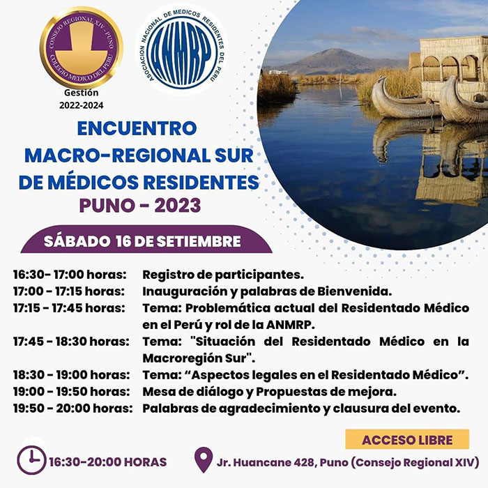 El evento se realizó en el Consejo Regional XIV Puno, desde las 16:30 pm hasta las 20:00 pm y tuvo como tema principal “Problemática actual del Residentado Médico en el Perú y el rol de la ANMRP”, concluyendo en una mesa de diálogo y propuestas de mejora.