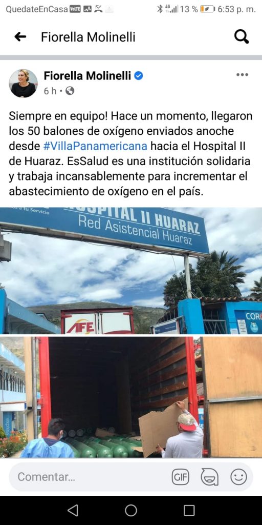 Ante el llamado dramático del presidente del Cuerpo Médico del Hospital II de Huaraz, Fernando Del Valle, anunciando que sólo tenían oxígeno hasta las 7 de la noche de ayer, la presidenta ejecutiva de EsSalud, Fiorella Molinelli, dispuso el envío de 50 balones enviados desde la Villa Panamericana que llegaron esta mañana, informó el dirigente médico.