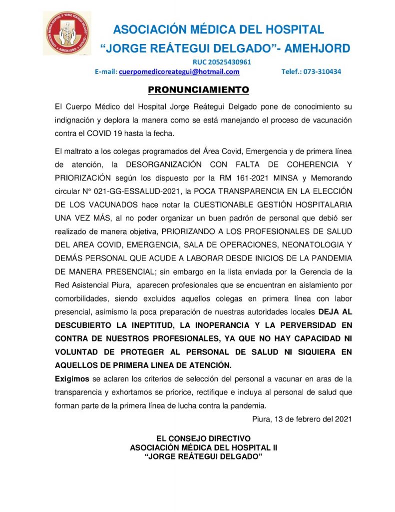 Cuerpo Médico del Hospital Jorge Reátegui de Piura rechaza proceso de vacunación