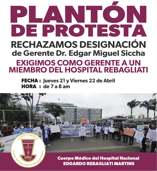 Noticias Plantón de protesta 20 de abril de 2022 at 3:43 pm RECHAZAMOS DESIGNACIÓN DE GERENTE DR. EDGAR MIGUEL SICCHA EXIGIMOS COMO GERENTE A UN MIEMBRO DEL HOSPITAL REBAGLIATI PLANTONES DE PROTESTAJUEVES 21 Y VIERNES 22 DE ABRILDE 7 A 8 AM Compartir: