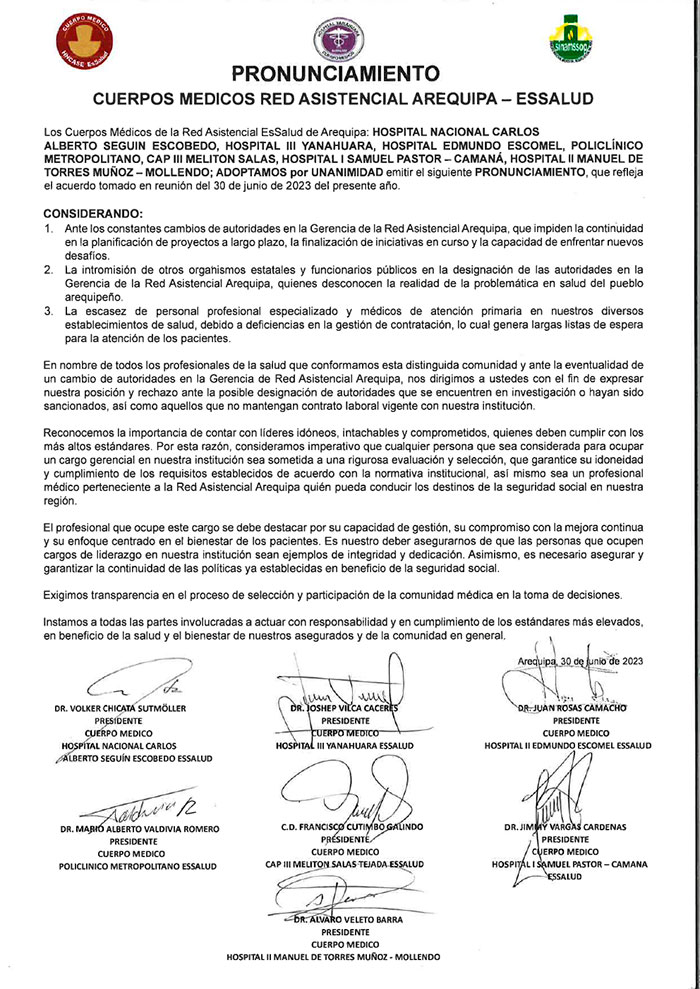 Los Cuerpos Médicos de la Red Asistencial EsSalud de Arequipa: HOSPITAL NACIONAL CARLOS ALBERTO SEGUIN ESCOBEDO, HOSPITAL I YANAHUARA, HOSPITAL EDMUNDO ESCOMEL, POLICLINICO METROPOLITANO, CAP I MELITON SALAS, HOSPITAL I SAMUEL PASTOR – CAMANA, HOSPITAL I MANUEL DE TORRES MUNOZ – MOLLENDO; ADOPTAMOS por UNANIMIDAD emitir el siguiente PRONUNCIAMIENTO, que refleja el acuerdo tomado en reunión del 30 de junio de 2023 del presente año.