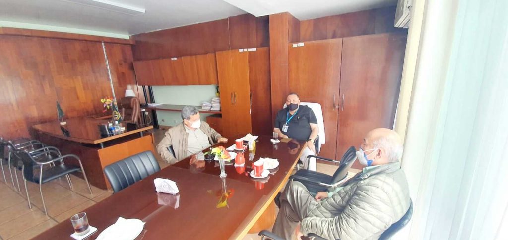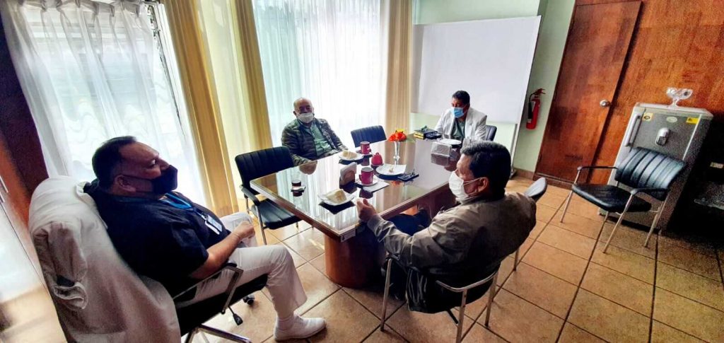 El secretario general del SINAMSSOP, Teodoro Quiñones, recibe a Hernando Zevallos, vocero en temas de Salud del candidato presidencial, Pedro Castillo, acompañado de Julio Castro, ex decano del Colegio Médico, para conversar sobre las propuestas de la alianza de izquierda. Participa de la reunión el secretario de Actas, Manuel Arredondo.
