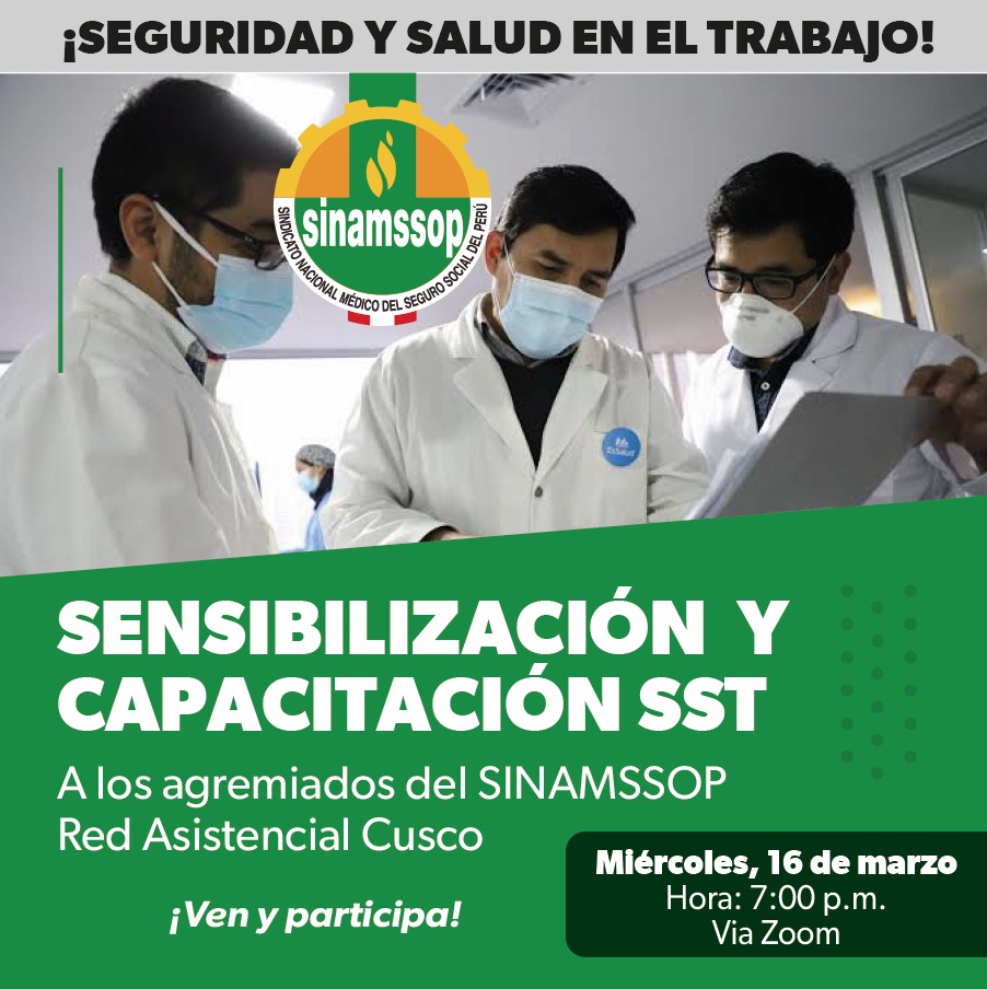 Noticias ¡Seguridad y salud en el trabajo! Sensibilización y capacitación SST 15 de marzo de 2022 at 11:49 am A los agremiados del SINAMSSOP – Red Asistencial Cusco Día: Miércoles, 16 de marzo de 2022Hora: 7:00 p.m.Via Zoom ¡VEN Y PARTICIPA! Compartir: